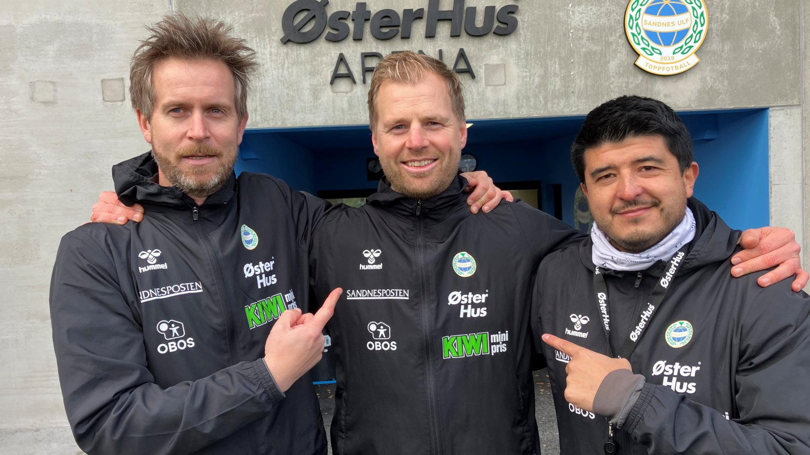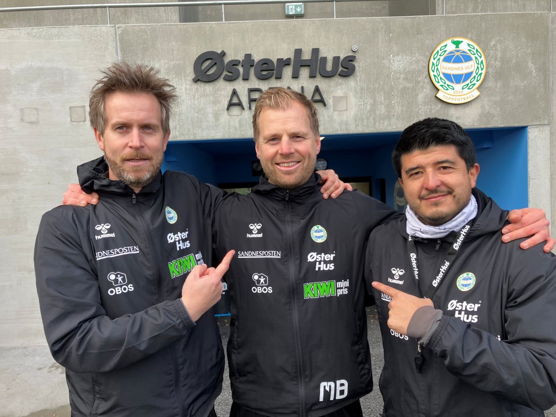 Her på bildet er tre av suksesstrenerne for A-laget til Sandnes Ulf på en av de siste treningene før lørdagens viktige opprykkskamp mot Arendal. Så peker Arturo (Cleveland) og Aleksander (Midtsian) på Michael (Bekke) som for anledningen er plassert i midten, men hvorfor i all verdens rike peker de på Bekke? (Tekst og foto: Svein Westlye)