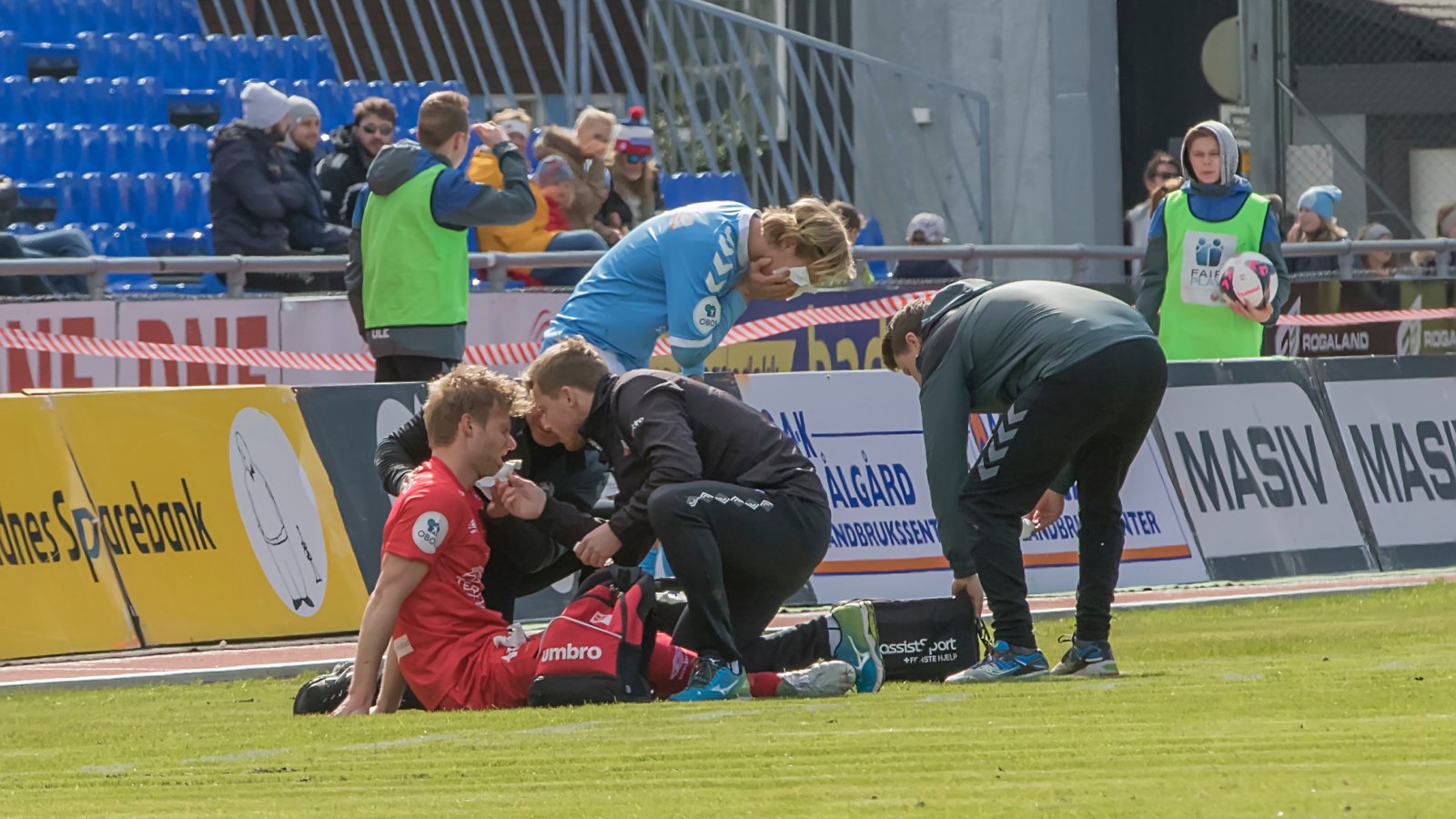 Kampen mot Fredrikstad var knapt kommet i gang før Viljar Helland Vevatne smalt i en Fredrikstad-spiller, og måtte til sykehus for å sy sting både rett over og rett under øyet.